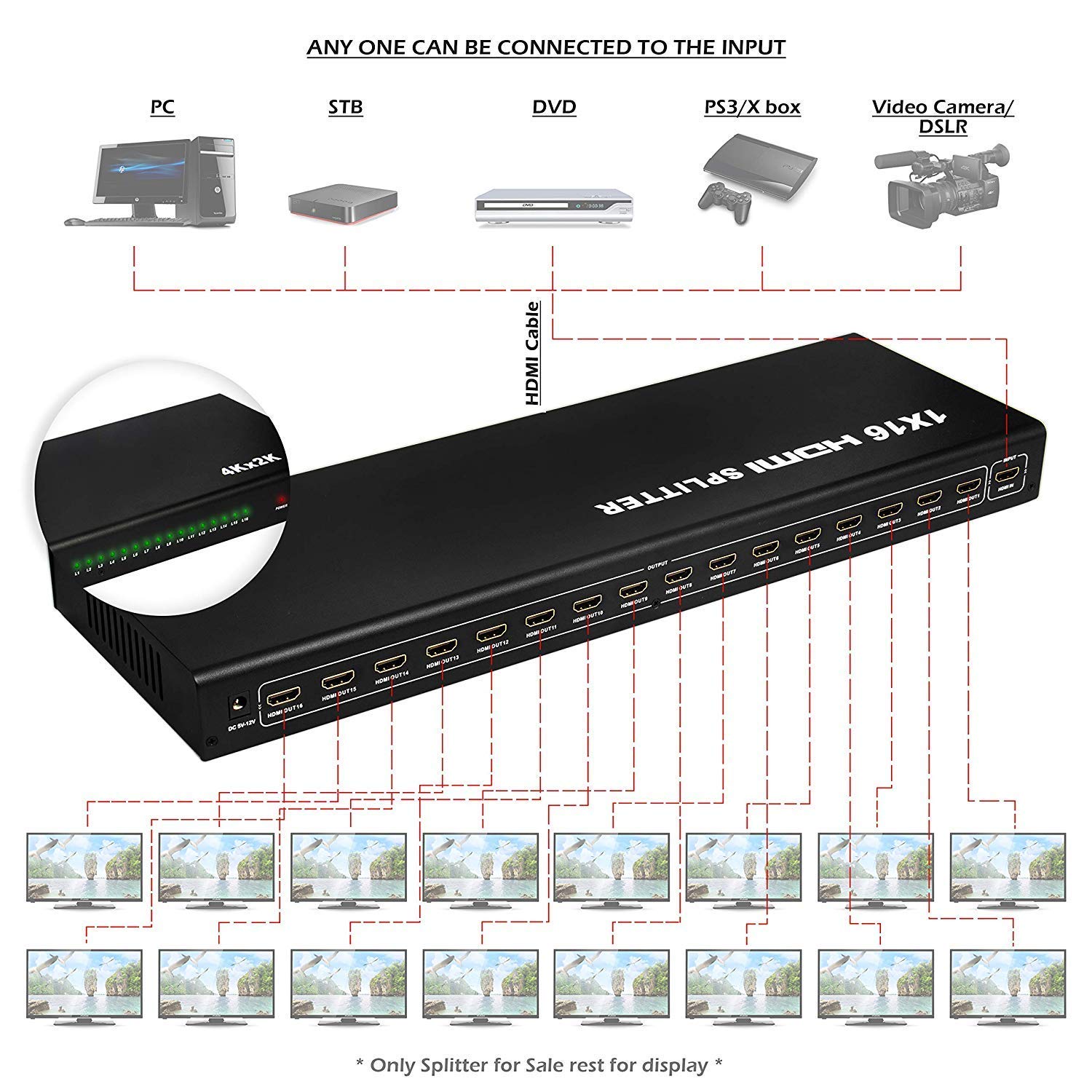 1x16 1 In 16 Out HDMI Splitter, HDMI Splitter Video Audio 1080P HD HDTV 3D